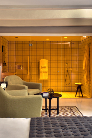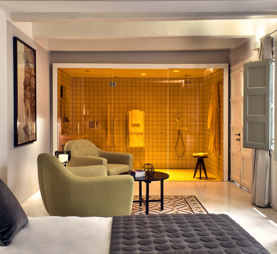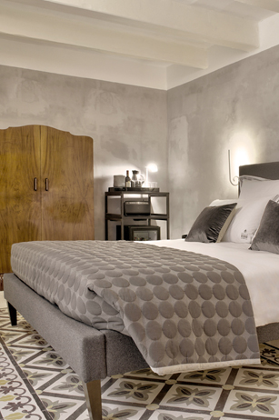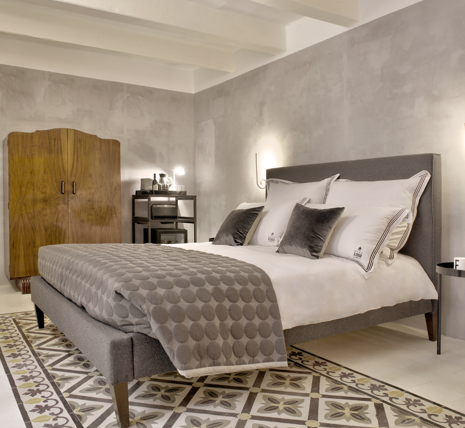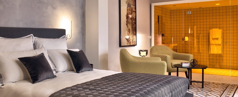 The rich soft furnishings that adorn this room are warm and welcoming. Charming features within the room include a luxurious Capri King size Etna grey bed, a cosy seating area consisting of two ochre yellow Ritchie armchairs, a gorgeously restored antique wardrobe and a magnificent print depicting the Virgin Mother and Valletta roof tops by Ritty Tacsum. Suite 1 also enjoys luxurious signature bed linen and pretty courtyard views from the balconies. Complimenting this room is a unique orange coloured glazed partition which leads to a spacious walk in shower / wet room. The room is equipped with a flat screen television, boxed into a unique designed vintage style set. This room is a quiet room as well as wheelchair accessible.