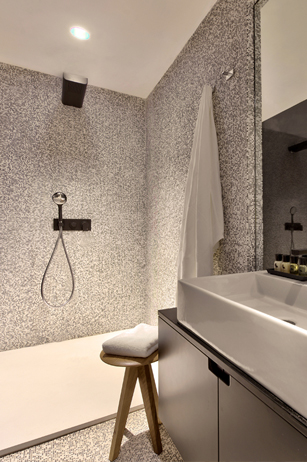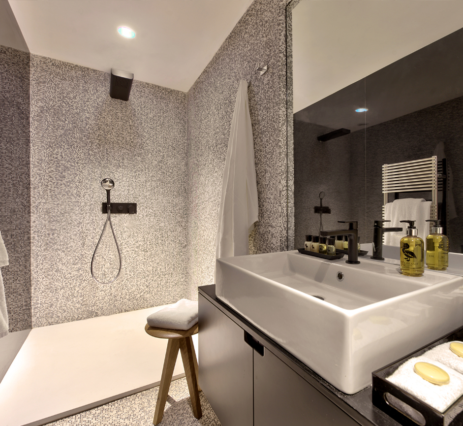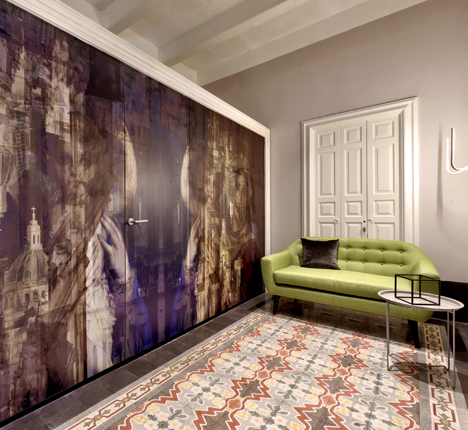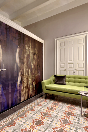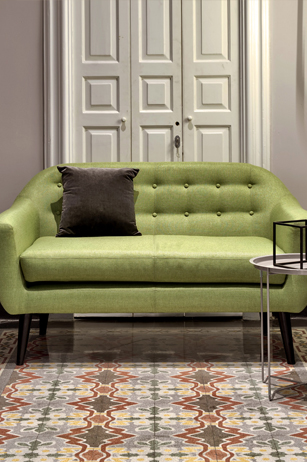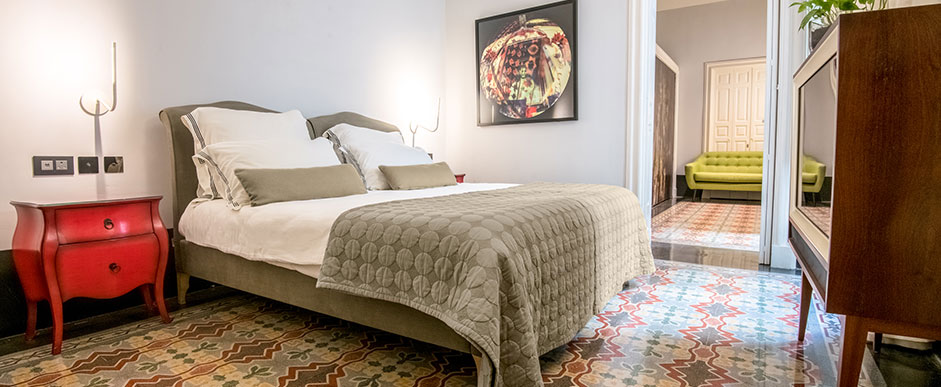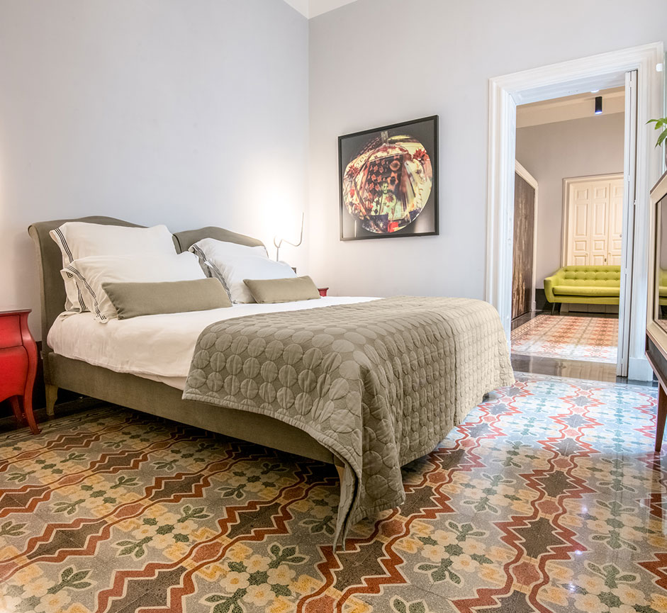 A spacious and quiet deluxe suite (possible to convert to twin beds) enjoying high ceilings and intricate warm coloured restored Maltese original floor tiles. Yet another exceptional Ritty Tacsum panoramic wall paper feature drapes the walls of the shower ensuite facilities. The shower consisting of Frammenti mosaic cladding by also has GESSI mixers and a TUBES towel warmer. This suite enjoys luxurious soft bed linen and has pretty courtyard views from the balconies. This room has the possibility of being interconnected to suite 5 ideal for families travelling with kids or a group of friends. A gorgeous lime green Ritchie sofa stands out and adds a classic style to the room.
