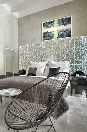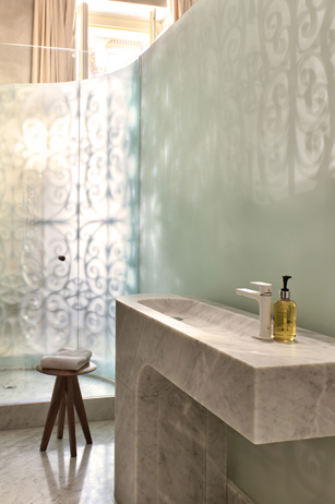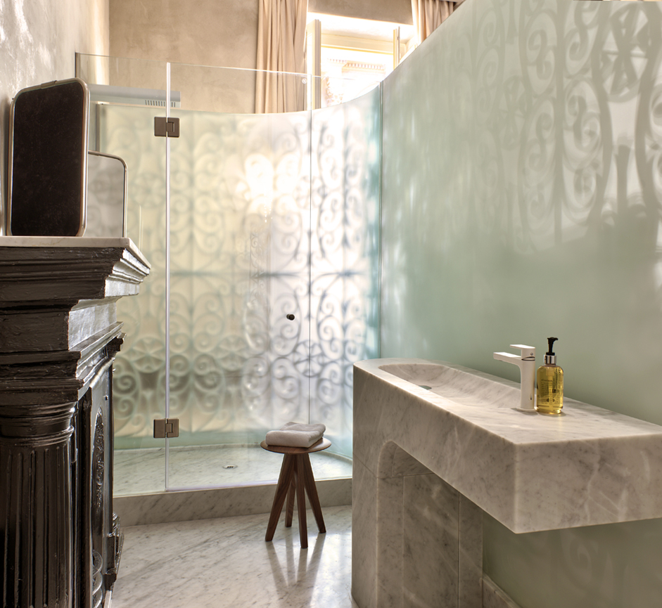 The grand suite forms part of the palazzo’s “piano nobile”. This stately suite enjoys a king size bed with an intricately designed wrought iron headrest behind which the original traditional fireplace lies together with a cantilevered marble wash hand basin which was designed and manufactured specifically for this suite; the shape was carved out of a large bianco carrara marble block. The shower facilities are also wisely concealed behind the glazed curved partition in a satin finish, allowing privacy but also taking advantage of the room’s natural lighting.