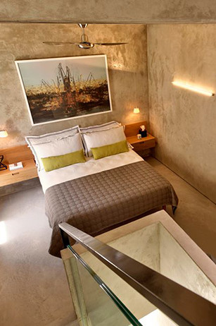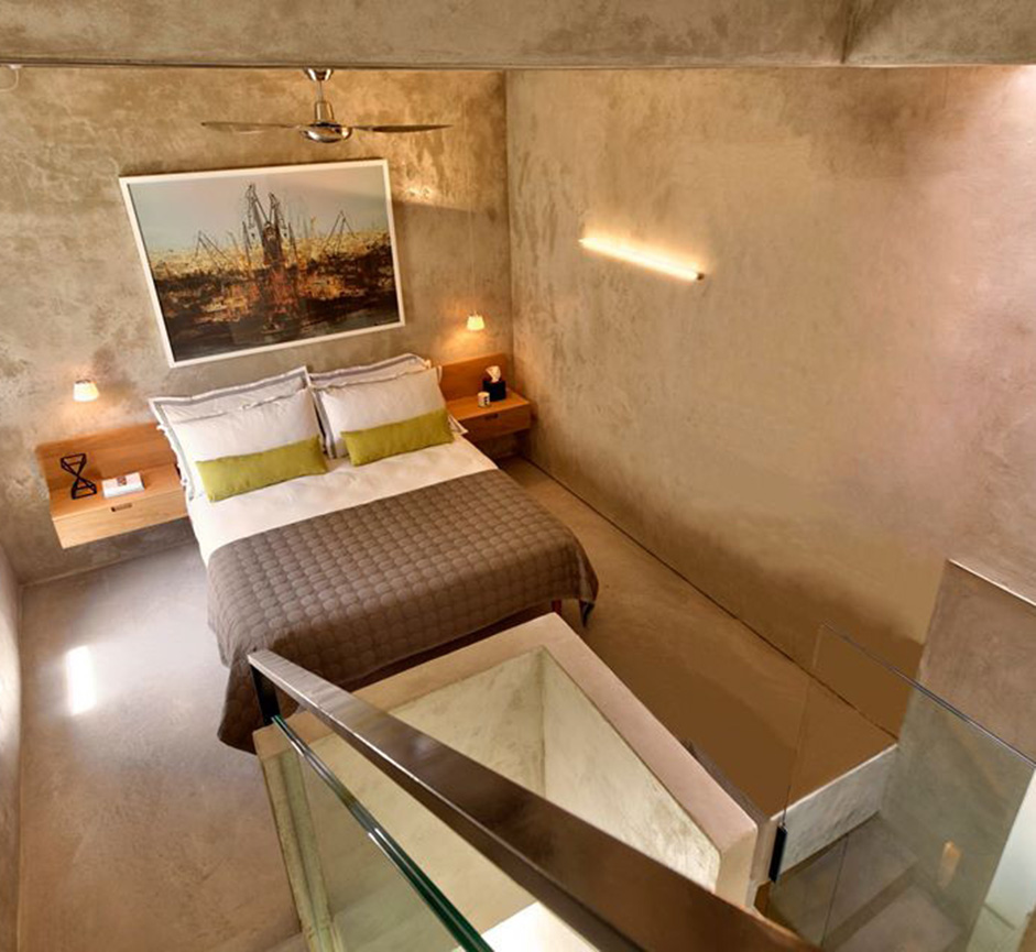 A skylight over a double volume space is situated exactly over the shower area. This cubicle is also visible from the staircase as one ascends to the bedroom or terrace. To the left of the bed lies a louvered door which leads out onto a terrace. An opaque glazed partition was introduced to the terrace for guest’s privacy however whilst sitting on the deep concrete bench one enjoys the view of Valletta’s many rooftops and Marsamxett Harbour on the other side of the terrace together with the majestic Carmelite Church facade and cupola.